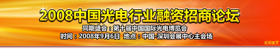 由中國(guó)科學(xué)技術(shù)協(xié)會(huì)、中國(guó)電子商會(huì)、中國(guó)科學(xué)院光電研究院、中國(guó)光學(xué)學(xué)會(huì)、中國(guó)國(guó)際光電博覽會(huì)辦公室主辦,中國(guó)光電產(chǎn)業(yè)高層論壇辦公室、中國(guó)光學(xué)學(xué)會(huì)國(guó)際會(huì)議展覽工作委員會(huì)承辦的“2008中國(guó)光電行業(yè)融資招商論壇”聯(lián)合國(guó)內(nèi)外多家著名金融投資機(jī)構(gòu)將于2008年9月7日在深圳會(huì)展中心隆重舉辦。
